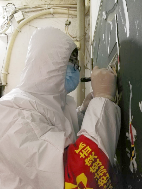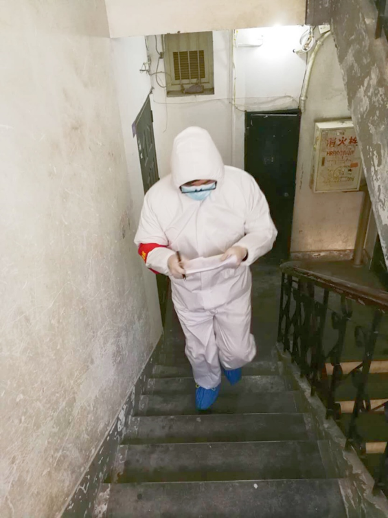 18日,又到了陈强值守的时间。由于当天是全市拉网式排查的第二天,有很多小区还未彻底完成排查,他和队友刘威一起,全力配合社区工作人员对香江新村小区、物资宿舍进行深度摸排。本着“不漏一户、不漏一人”的原则,陈强和队友通过上门走访的方式共计摸排5个小区、8栋单元楼、200户居民,涉及400余人。由于摸排对象都是老旧小区,只能爬步梯一层层去摸排,加上防护服密闭不透气,陈强不停上上下下,汗如雨下,内衣都湿透了。