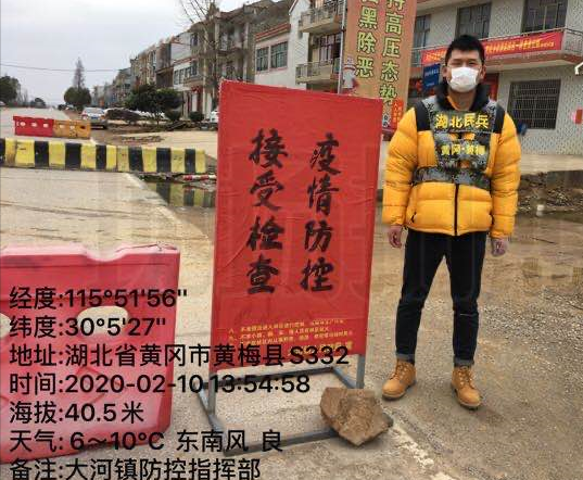 洪康是开投公司旗下新能置业(海外投资)公司员工,是一名退伍军人,三年的军旅生涯练就了他不怕吃苦、勇往直前、乐于奉献的品格。春节前,洪康与家人回了黄冈老家。由于黄冈是仅次于武汉和孝感的重疫区,看到那么多的医务人员在一线冲锋陷阵,洪康觉得自己身为一名国企员工,在国家有需要时有责任挺身而出,为抗击疫情出一份力,于是他报名加入当地抗击疫情的志愿者行列。从2月10日开始,在当地防控指挥部的安排下,洪康主要负责在黄梅县S332号国道卡点拦截过往车辆。从早上8点开始到岗值守,中午在临时搭建的简易棚下简单地扒几口盒饭又马上投入工作。在第一天的值守中,洪康和伙伴们就拦截各类车辆约210辆,其中部分车主不太配合,他也耐心劝导,最终都顺利说服车主返回,为当地落实外防输入、内防扩散的政策作出了应有的贡献。