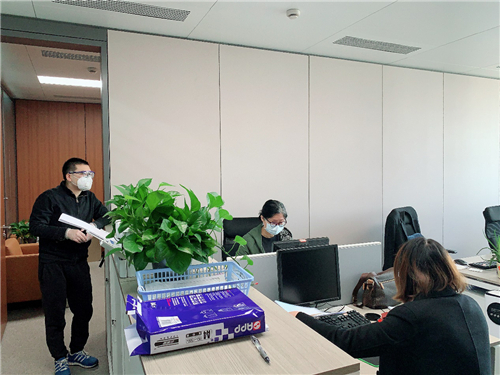 疫情期间,公司按照规定做好各项值班安排,每天的值班人员会对公共区域门窗、空调、水电情况进行检查。总裁办会做好工作区域公共环境卫生、公共垃圾清运及消毒工作,为员工准备基本防护用品,创建无感染、无后顾之忧的工作环境。