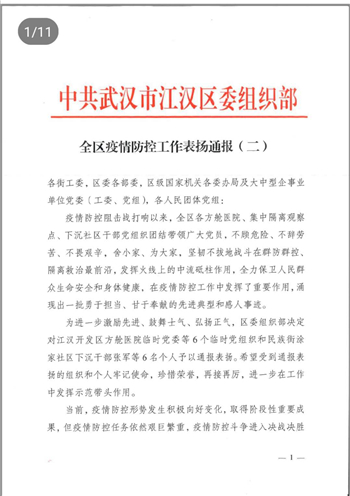 3月22日,江汉区委组织部发布了《全区疫情防控工作表扬通报(二)》(以下简称“《通报》”),开投公司总经理助理杨勇同志因为下沉社区工作表现突出获得通报表扬。